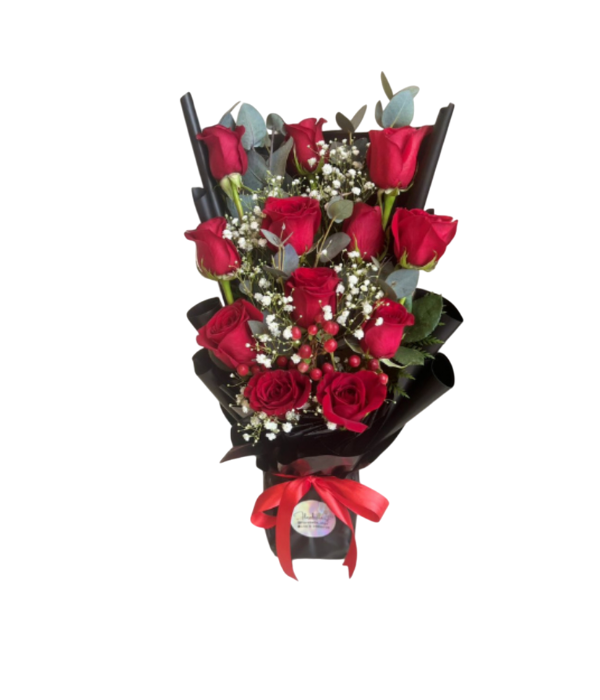 Impresionante diseño vertical con rosas rojas premium, gypso natural, hojas de eucalipto, envuelto en papel negro con un lazo rojo que realza su elegancia.