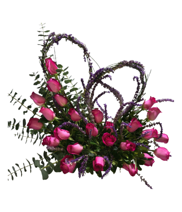 Elegante composición con rosas rosadas en diferentes tonos, realzadas con delicadas flores lavanda y follaje verde, formando un diseño romántico y sofisticado ideal para transmitir amor, gratitud o admiración. Perfecto para ocasiones especiales, celebraciones o simplemente sorprender a alguien querido.