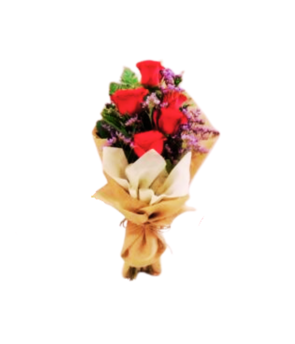 5 Rosas rojas, follaje morado y verde de temporada y papel rústico con doble capa. Un arreglo floral perfecto para transmitir pasión y amor profundo.
