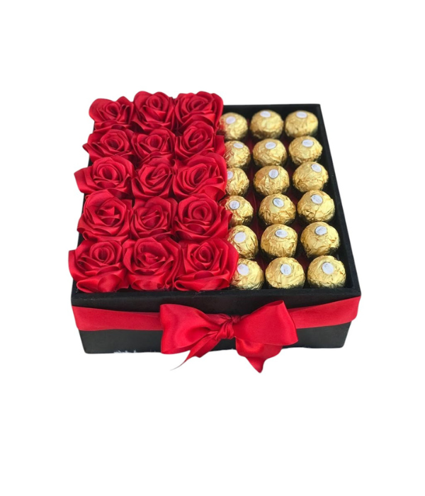 Exclusiva caja que combina rosas de jabón rojas y chocolates Ferrero, un obsequio sofisticado que une dulzura y elegancia en un solo detalle.
