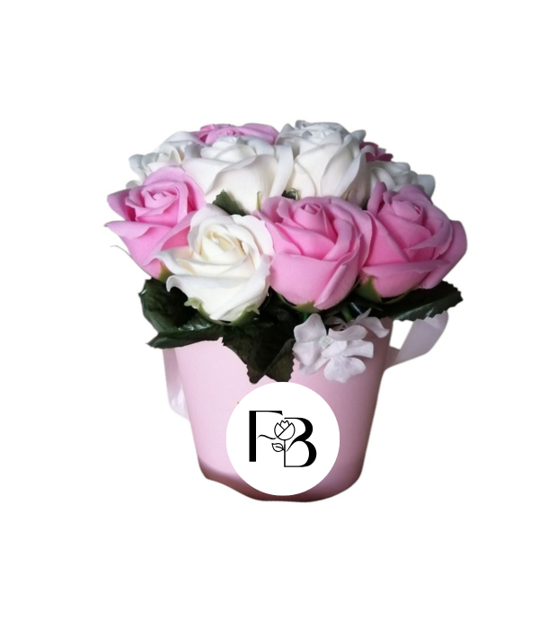 Un encantador arreglo con rosas de jabón en tonos suaves rosados y blancos. Ideal para decoración o regalo.