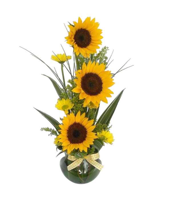 Arreglo con tres girasoles en altura, acompañados de margaritas amarillas, follaje verde y detalles decorativos en un florero de vidrio con lazo.