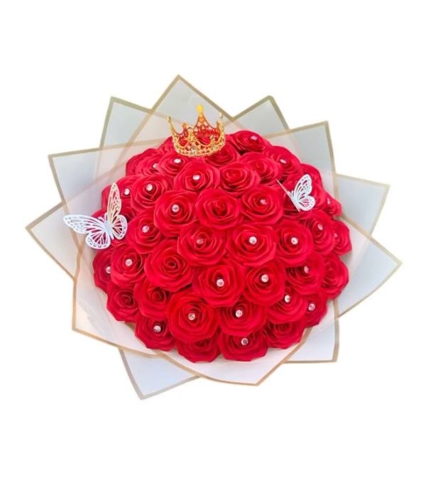 Rosas de jabón rojas en Ramo Buchón decorado con mariposa y pequeña corona dorada. Un regalo digno de reina.