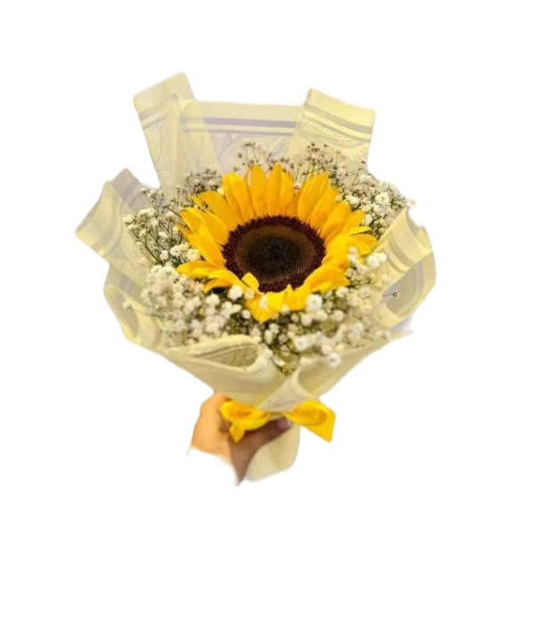 Un delicado ramo con un girasol central rodeado de gypsophila blanca (velo de novia), envuelto en papel decorativo amarillo con lazo a juego.