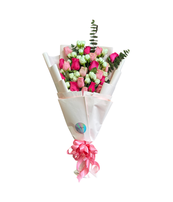 Bouquet moderno con rosas en contraste rosado y blanco, envuelto en papel elegante y moño rosado. Perfecto para ocasiones románticas o de amistad.