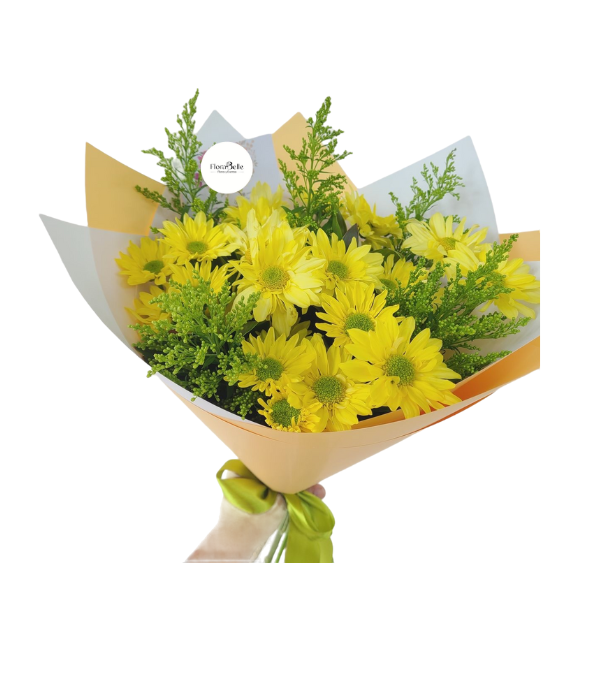 Ramo clásico de margaritas amarillas envuelto con estilo moderno. Un detalle sencillo y alegre para cualquier ocasión.
