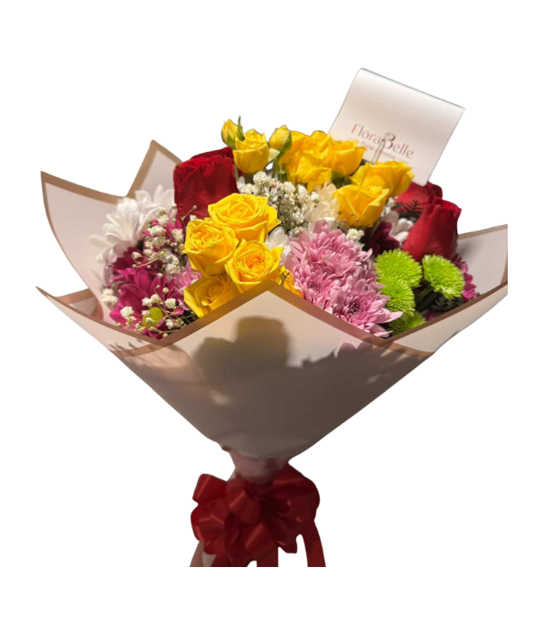 Ramo alegre con rosas amarillas y rojas, acompañado de crisantemos en tonos rosados y verdes. Un regalo lleno de color y energía.
