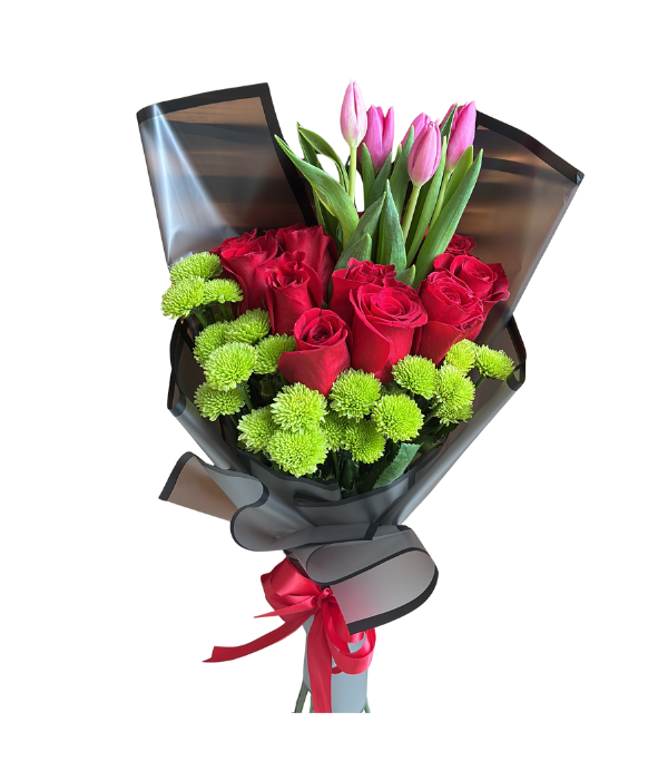 Impactante Ramo con rosas rojas, tulipanes rosados y crisantemos verdes, envuelto en papel negro elegante. Ideal para ocasiones románticas.