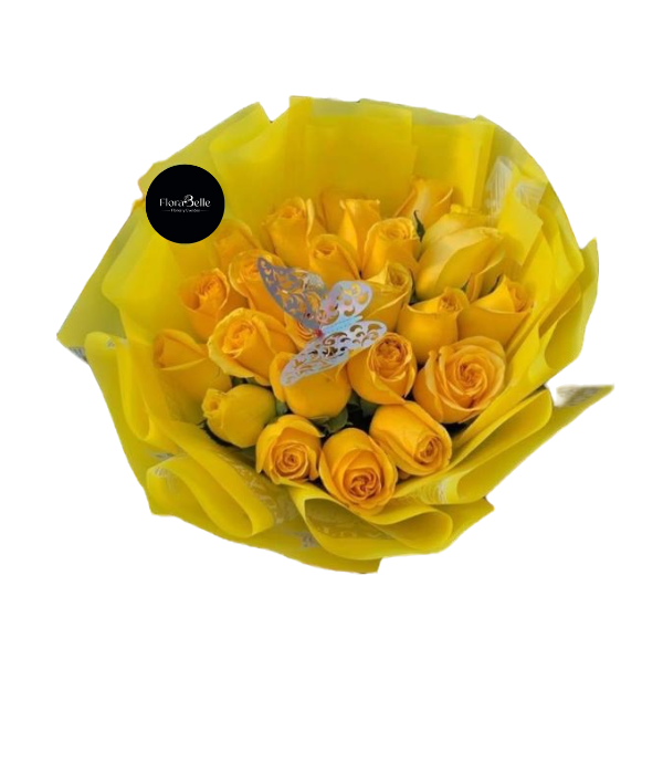 Exclusivo arreglo de rosas amarillas acompañado con mariposa decorativa, ideal para obsequios especiales llenos de vida y color.