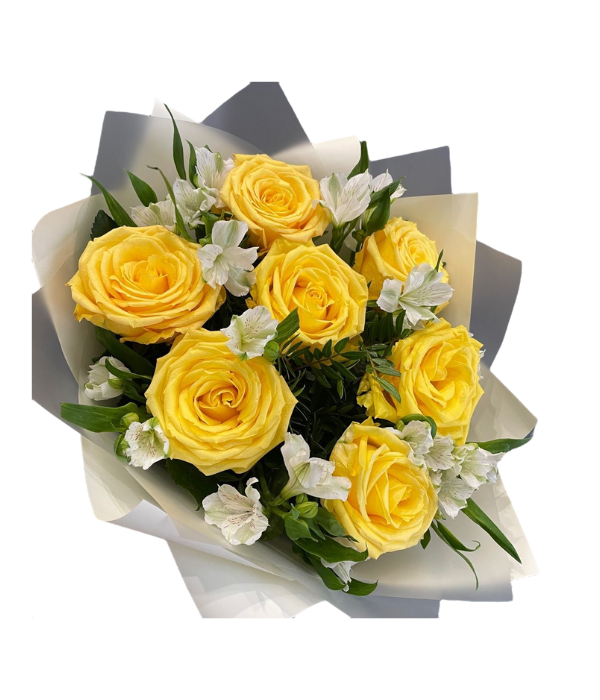 Bouquet elegante de rosas amarillas acompañadas con astromelias blancas y follaje, ideal para expresar cariño y gratitud con un toque vibrante.